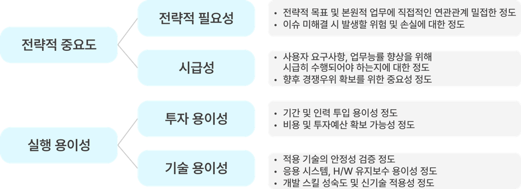 - 시급성: 전략적 중요도와 목표 가치(KPI) 부합하는지 여부 → 가치